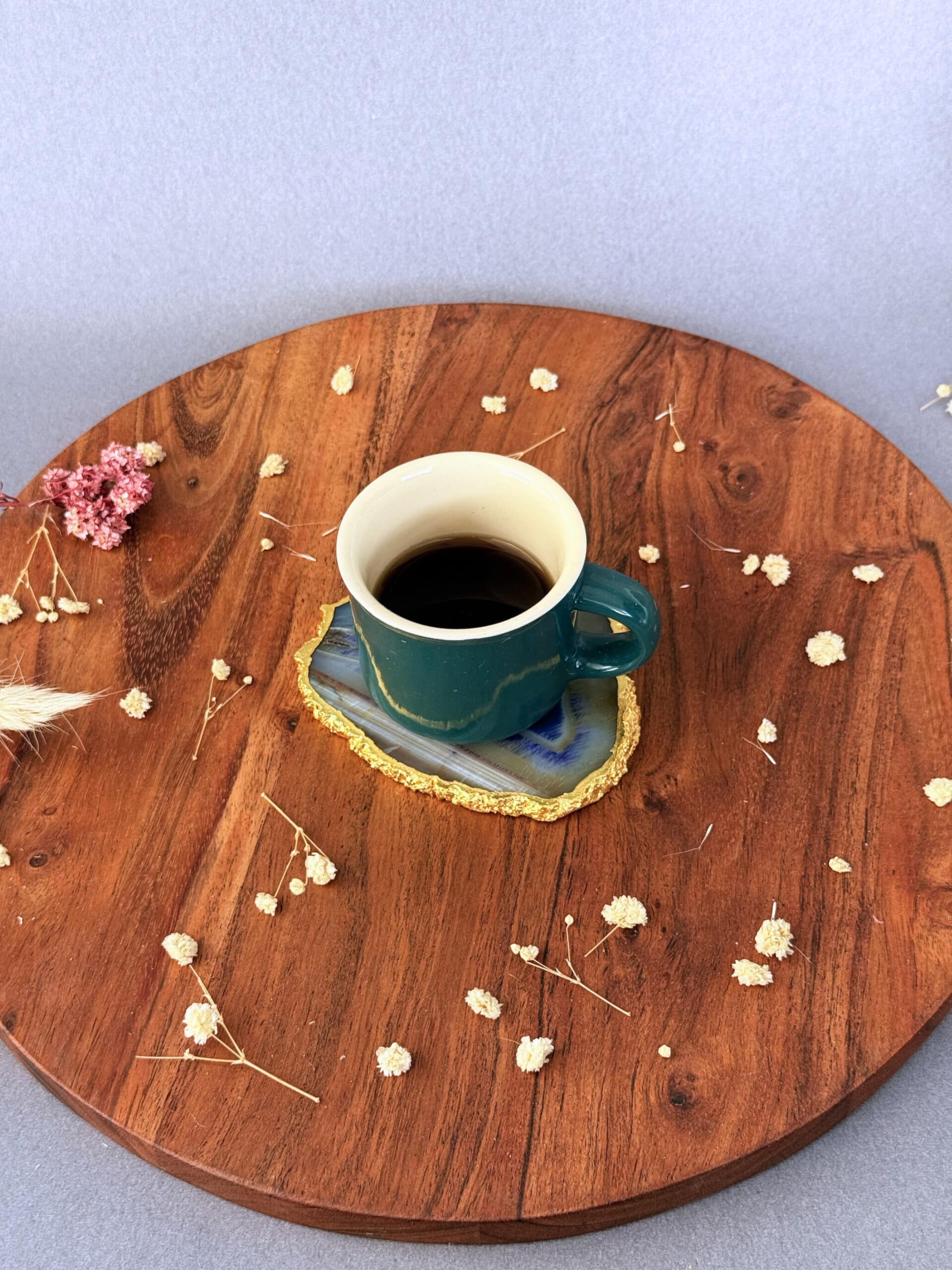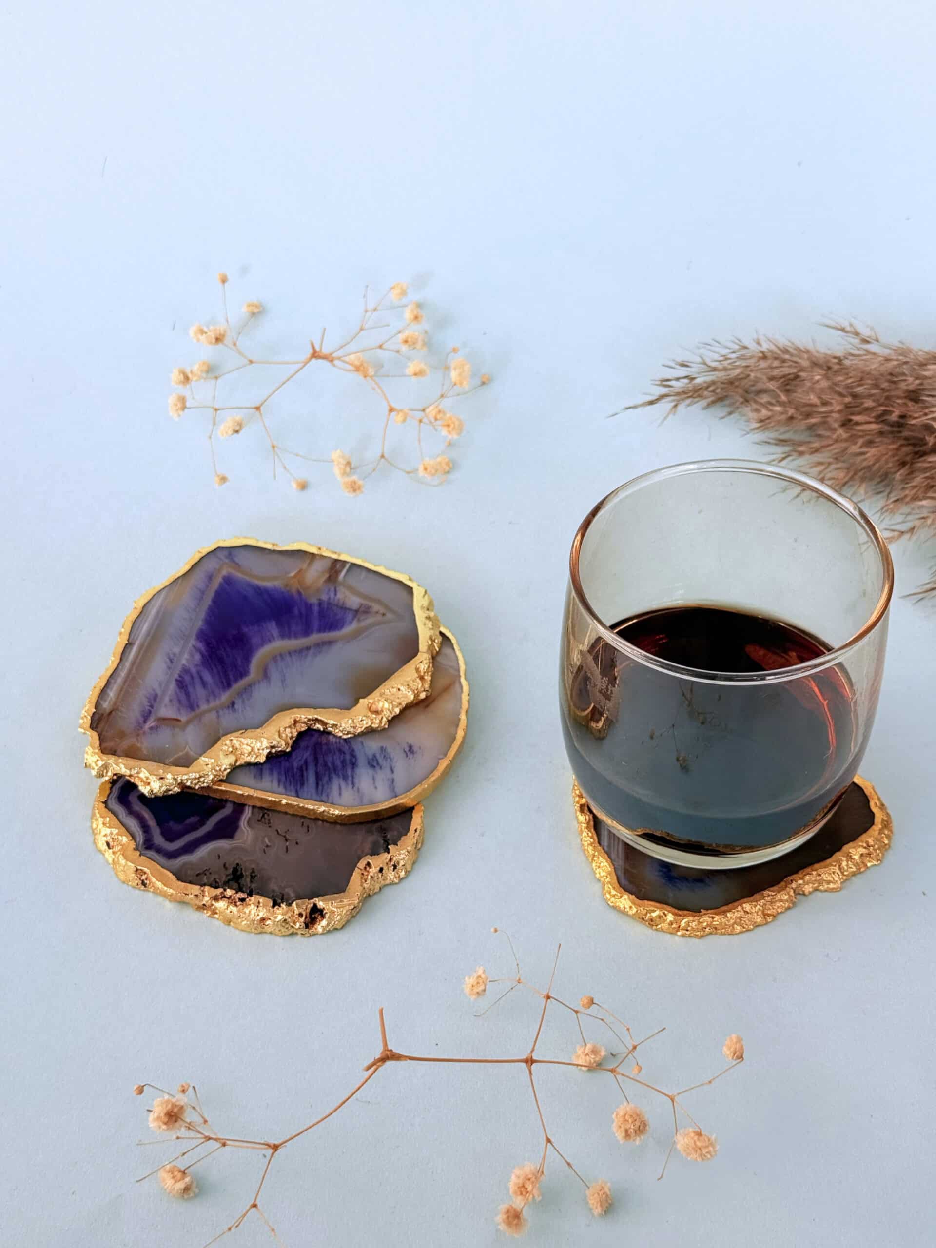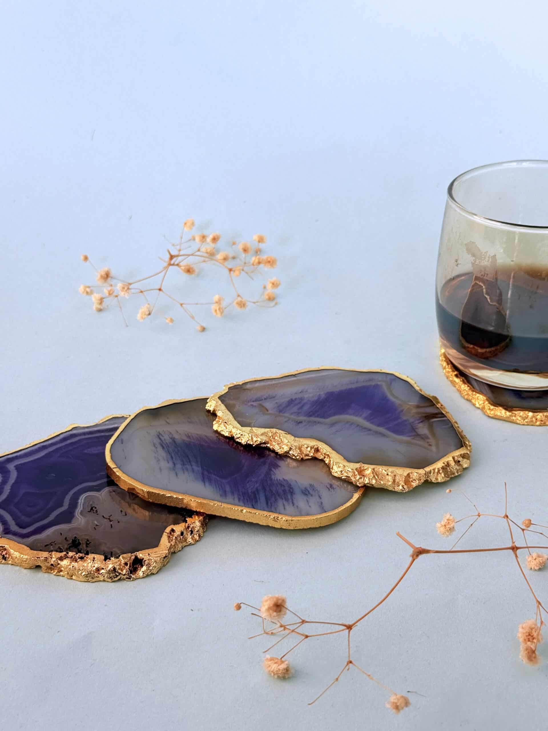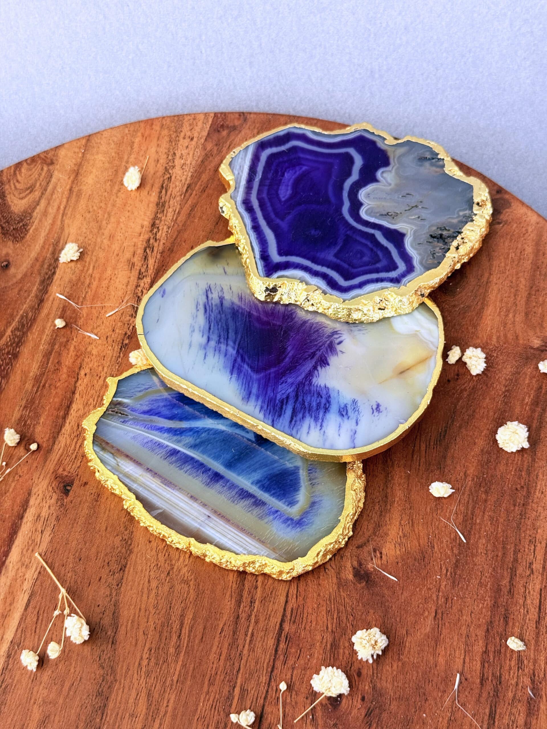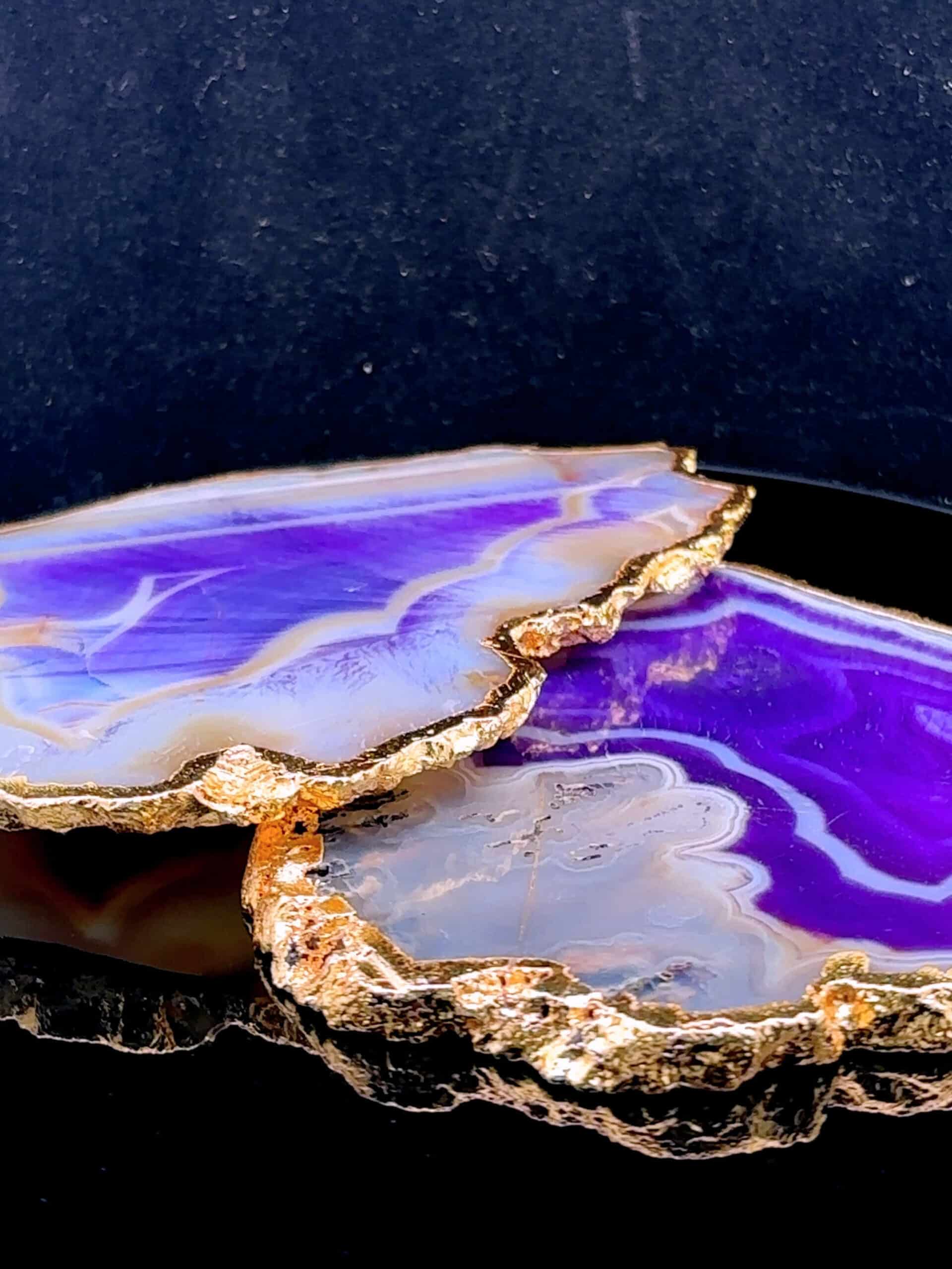 Purple Agate Golden Coasters – Elegant & Mystical Home Décor. Add a touch of luxury and mysticism to your space with these Purple Agate Golden Coasters, crafted from natural Purple Agate stone. Known for its protective and calming properties, Purple Agate enhances spiritual awareness, emotional stability, and inner peace, making it a perfect blend of beauty and energy for your home. Purple Agate Coasters combine functionality with elegance, making them both a practical and spiritual addition to any home. Whether used for serving drinks, protecting surfaces, or as a decorative accent, they bring a sense of calm, protection, and refinement to your space.