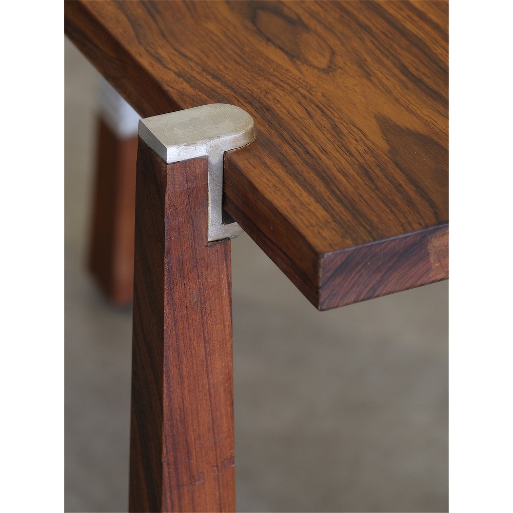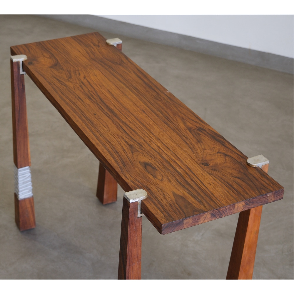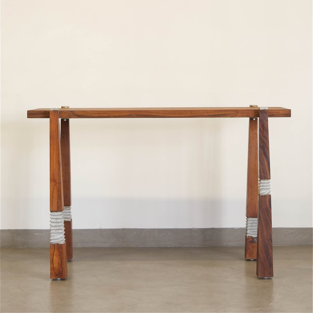Crafted with precision, the Plug-in Console Table combines sleek designer aluminium casting with tapered solid wood, creating a striking visual contrast while ensuring durability and stability. The design takes inspiration from the simple yet ingenious practice of folding paper to stabilize wobbling tables, transforming a practical solution into a bold and artistic concept. This playful yet functional design makes the table a true conversation starter, seamlessly blending practicality with aesthetics. With its unique construction and modern silhouette, the Plug-In Console Table redefines contemporary furniture, making it a stylish and versatile addition to any living space.