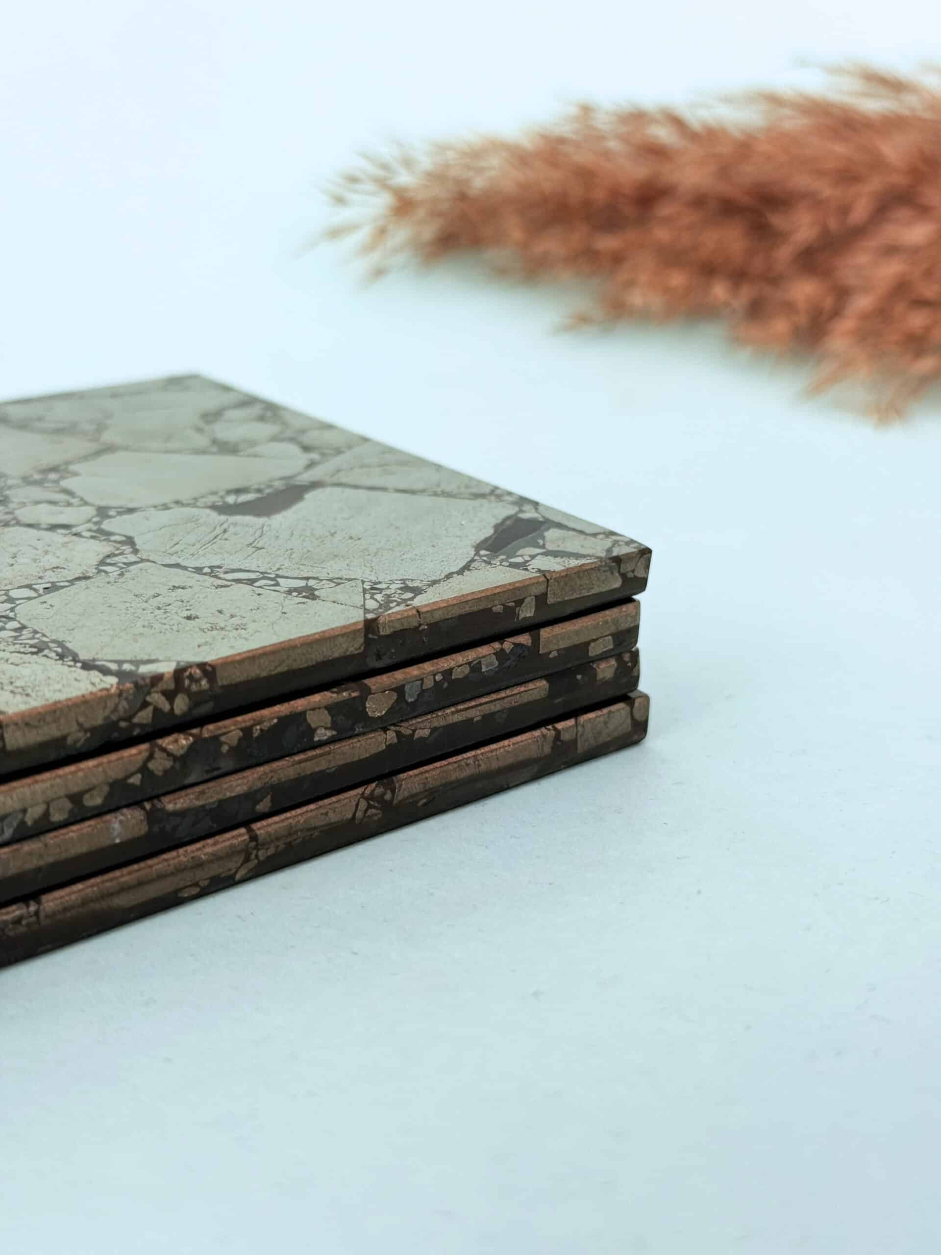 Add a touch of elegance and protection to your space with these Pyrite Square Coasters, crafted from natural Pyrite stone. Known as the “”Stone of Protection”” and “”Fool’s Gold,”” Pyrite is believed to shield against negative energy, boost confidence, and promote vitality, making these coasters a perfect combination of beauty and functionality for your home or office. Pyrite is not just a functional coaster, but a symbol of protection and prosperity. Whether used to protect your furniture, as a decorative accent, or an energy amplifier, it brings strength, abundance, and grounding into your space.