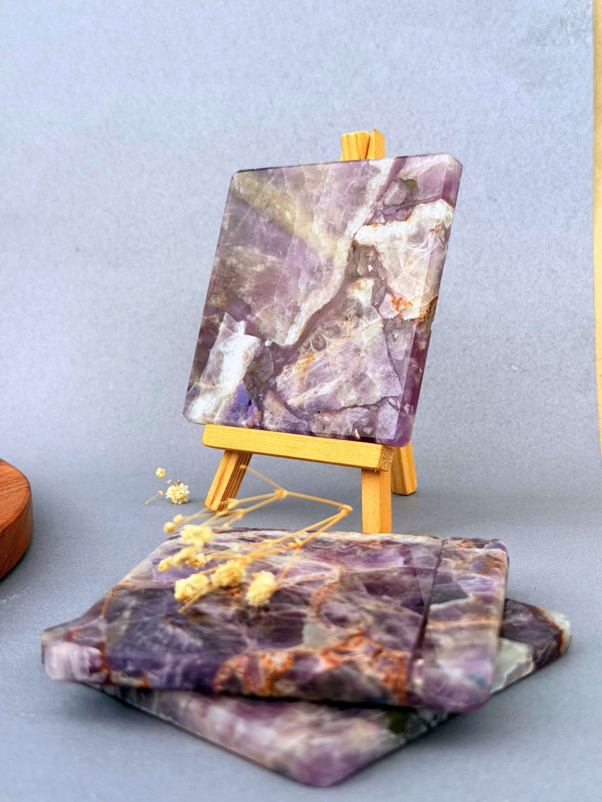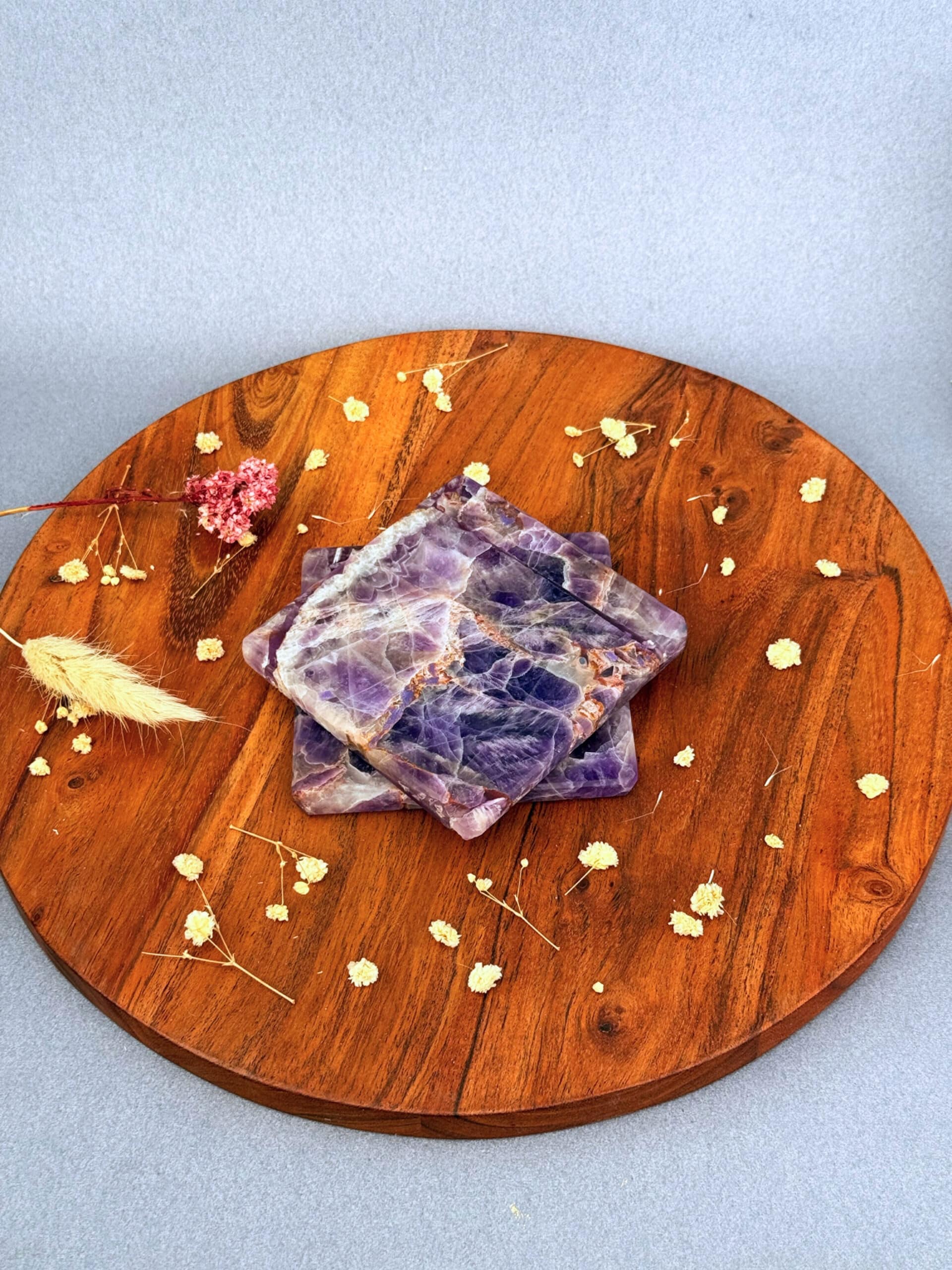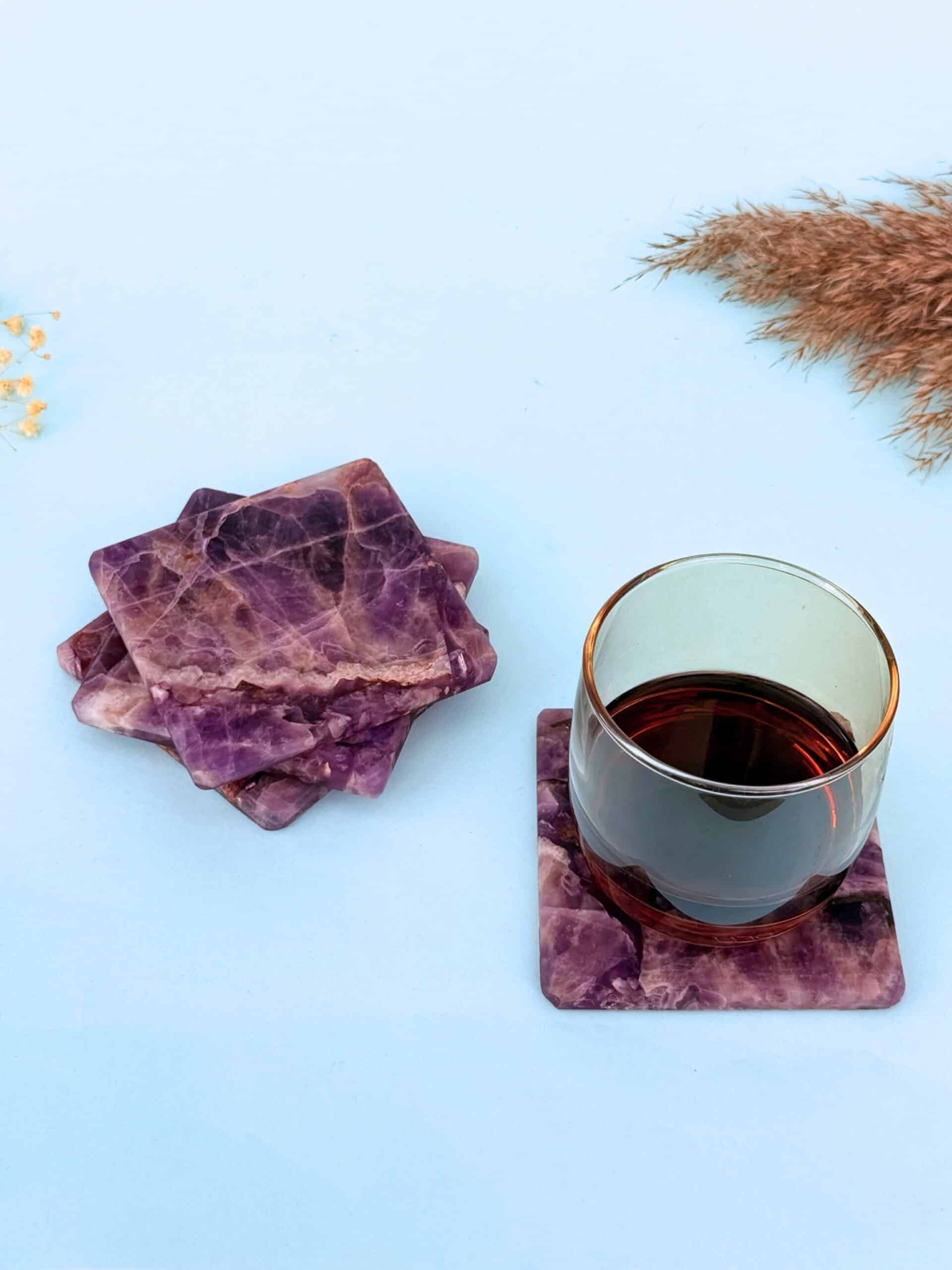 Add a touch of elegance and protection to your table with these Amethyst Square Coasters, crafted from natural Amethyst stone. Known as the Stone of Spirituality,”” Amethyst is celebrated for its calming, healing, and protective properties, making these coasters not only a functional accessory but also a piece of energy-balancing décor. Amethyst Square Coasters are not just practical, but a symbol of tranquility, healing, and spiritual protection. Whether used for serving beverages, as an energy tool, or as a decorative piece, they bring peace and positive vibes into your home.
