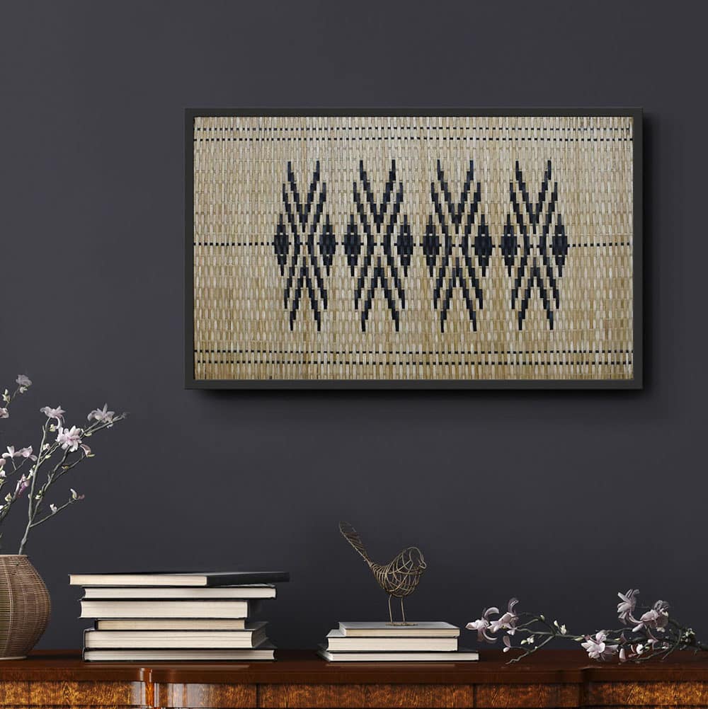 The Vismay Sangrah features woven geometric bamboo wall art, inspired by the free-hand facial and leg tattoos once prevalent among tribal women in North East India and various Southeast Asian countries. These intricate patterns, etched onto the skin, symbolized milestones such as coming of age, social standing, marital status, and personal growth. More than mere adornments, these designs held deep cultural significance, carrying the stories and identities of generations past. Through this collection, Pusaaka seeks to honor these traditional art forms, continuing the legacy with bamboo—the common medium that has long connected tribal communities. This piece is framed as shown.